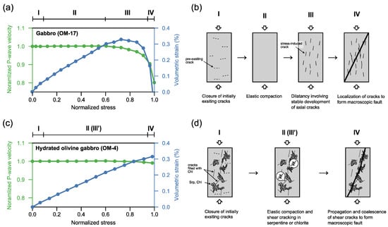 Ultrasonic and mechanical data with schematic diagrams showing the stages of brittle deformation for gabbro (OM-17) and hydrated olivine gabbro samples (OM-4). Normalized P-wave velocity and volumetric strain estimated from calculated crack density, assuming the aspect ratio to be 0.01, are plotted against normalized differential stress (a,c). Schematic models of the brittle deformation mechanisms in gabbro and hydrated olivine gabbro (b,d). The onset of each stage of deformation in relation to the ultrasonic and mechanical data is shown at the top of (a,c), respectively.