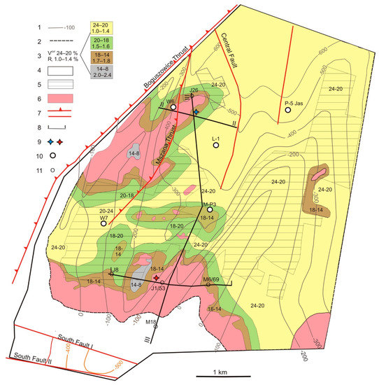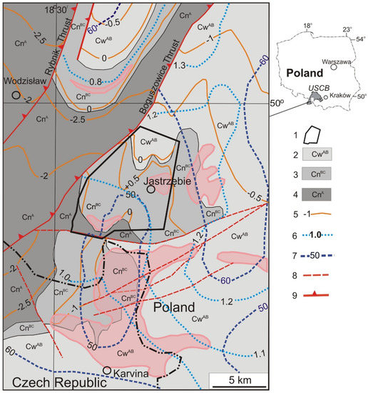 - Jureczka, J.; Dopita, M.; Gałka, M.; Krieger, W.; Kwarciński, J.; Martinec, P. Geological Atlas of Coal Deposits of the Polish Czech Patrs of the Upper Silesian Coal Basin 1:200 000; Polish Geological Institute: Warszawa, Poland, 2005. [Google Scholar]