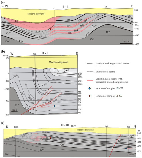 Coal and coal-bearing rocks in the south-western part of the Upper Silesian Coal Basin (USCB) of Early Pennsylvanian (Namurian BC) age underwent changes resulting in the partial/complete disappearance of coal seams over an area of ca 500 km2. This disappearance is associated with gangue rocks of various colors, typically located above the seams. Maximum noticed thickness reduction up to disappearing was observed in coal seam No. 505, which, with a regular thickness of ca 5 m, shows this most clearly—though the problem concerns coal seams Nos. 415/1 and 510 [1], 504, 505 and 506 [2,3,4] and 406/4 [5], exploited in both the Polish and Czech parts of the USCB. The coal there, if any, is grey-black, dull, heavily cracked, brittle and without a banded structure. The altered, variably colored coal-bearing rocks are characterized by increased fracturing, porosity and reduction of physical and mechanical properties [6,7], all a reflection of oxidation and heating.