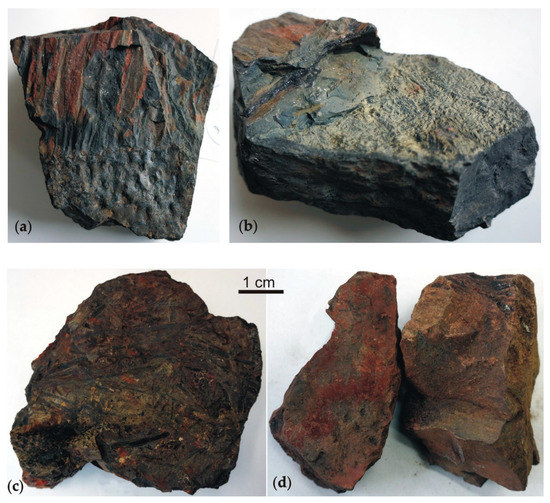 Samples collected from the vicinity of the disappearing coal seams located in the northern part, (a) sample N1 and (b) sample N4, and southern part, (c) sample S2 and (d) sample S5, of the Jas-Mos mining area, a part of the Jastrzębie-Bzie Coal Mine.