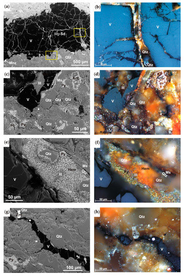 Back-scattered electron BSE (a,c,e,g) and reflected light optical microscopy RLOM (b,d,f,h) images of samples collected in the northern part of the Jas-Mos mining area. (a) Veins filled with (Mg, Fe)CO3 (Mg-Sd) and quartz (Qtz) in vitrinite (V). Framboidal pyrite (Py) and accessory monazite (Mnz) are present. Right yellow rectangle is enlarged in (b), left rectangle in (c) and (d). (b) Quartzitic–carbonatic veinlets in vitrinite. (c,d) Secondary anatase (Ant) and halite (Hl) among quartz, muscovite (Ms) and clay minerals. (e,f) Framboidal pyrite partly replaced by hematite (Hem). (g,h) Accessory zircon (Zrn) detected by SEM-EDS and visible in RLOM image. Sample N6.