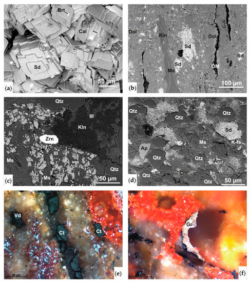 Back-scattered electron BSE (a–d) and reflected light optical microscopy RLOM (e–f) images of samples collected in the southern part of the Jas-Mos mining area. (a) Siderite (Sd) rhombohedra, calcite (Cal) and barite (Brt) occurring in fractures in sample S1; (b) carbonates impregnating the gangue rock with dolomite (Dol) forming veins along the organic matter (OM) and kaolinite (Kln) and muscovite (Ms) form interlayers in sample S2; (c) quartz (Qtz), muscovite, kaolinite, illite (Ill), siderite and accessory zircon (Zrn) in sample S3; (d) secondary hydroxylapatite (Ap), anatase (Ant) among quartz, K-feldspars (K-fs), muscovite, Fe-chlorite (Chl), siderite and clay minerals in sample S5; (e) cracked collotelinite (Ct) and vitrodetrinite (Vd) particle in mineral matter in sample S3; (f) graphitized carbon in sample S4.