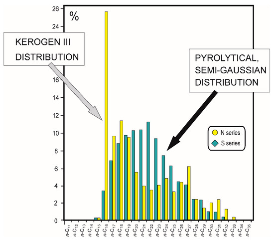 n-Alkanes (m/z = 71), in the range n-C15–n-C33, show a monomodal distribution with a smooth outline for the reddish samples and a bimodal distribution type for the grey samples (Figure 10). The latter is similar to n-alkane distributions found in Upper Silesia bituminous coals or accompanying rocks; it is common in mature organic matter of terrestrial origin. In addition, values of the Carbon Preference Index fit those found for USCB organic matter, i.e., 1.50 on average [16,52]. However, the n-alkane distributions in the reddish-rock extracts are more unusual in showing a smooth Gaussian-type outline, closer to pyrolytical n-alkane distributions found in coal pyrolysates or coal-waste rocks subjected to self-heating [53,54]. CPI values are also slightly lower for the reddish rocks at 1.30, on average, though it seems that long-chain n-alkanes still preserve the primary pattern of distribution and the Gaussian hump is located in the short-chain n-alkanes range. The maximum Gaussian hump is slightly different in different southern samples, i.e., at n-C18 for S2 and n-C21–n-C22 for the remainder. Such variation can be due to different degrees of heating affecting organic matter, whether by a paleofire or an intrusion; coal-waste rocks subjected to self-heating show the same feature [55,56].