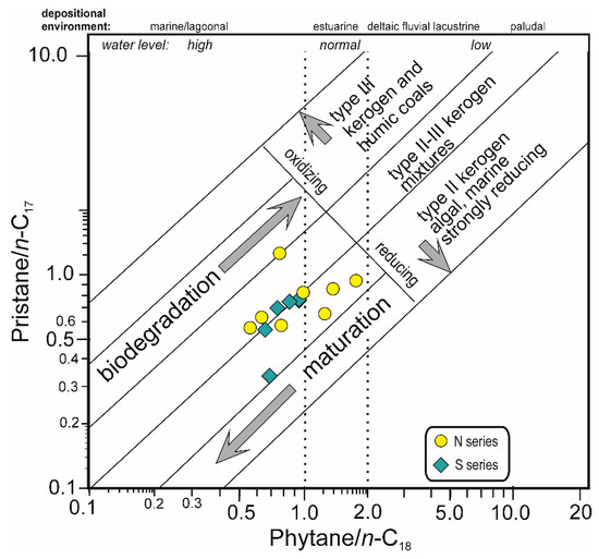 The same differences in Pr/Ph values are apparent in both sample sets, which are low (0.52 on average) in the reddish rocks, but for grey rocks reach values (2.02) common for USCB bituminous coals [16,52]. It is possible that thermal stress caused rapid preferential expulsion of lighter compounds, such as Pr, from the kerogen macromolecule, decreasing Pr/Ph values. A decrease in Pr/Ph values with increasing thermal maturity can occur with organic matter evolution within a deposit [57]. Moreover, preferential expulsion of lighter n-alkanes is confirmed by lowered Pr/n-C17, Ph/n-C18 and (Pr+Ph)/(n-C17 + n-C18) values (Table 4; Figure 11). However, the variability of values of these ratios is high and the general ranges of Pr/n-C17 and Ph/n-C18 in Figure 10 overlap. Assuming that the grey rocks better retain the unaltered values of the ratios, Figure 10 indicates that organic matter was deposited in a dysoxic estuarine or lagoonal environment at a high to normal water level and kerogen is mostly of II/III type. However, the influence of heating, as seen in the case of the reddish rocks that plot in the field of much more mature organic matter and, likewise, with some grey samples, may indicate a shift due to paleofires.