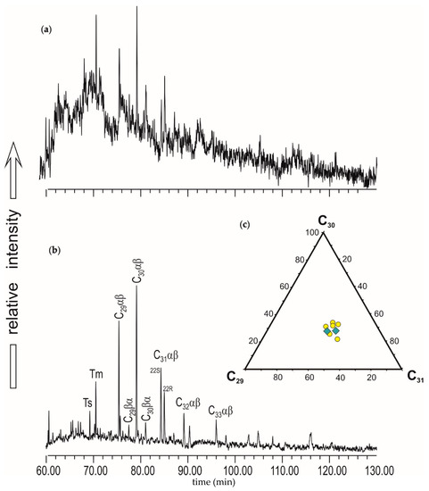 Pentacyclic triterpanes distributions in: (a) sample N6; (b) sample S3; (c) ternary diagram of C29-C30-C31 relative percentages. Ts, 18α(H)-22,29,30-trisnorneohopane; Tm, 17α(H)-22,29,30-trisnorhopane; C29αβ, 17α(H),21β(H)-29-norhopane; C29βα, 17β(H),21α(H)-29-norhopane; C30αβ, 17α(H),21β(H)-29-hopane; C30βα, 17β(H),21α(H)-29-hopane; C31αβ, 17α(H),21β(H)-29-homohopane; C32αβ, 17α(H),21β(H)-29-bishomohopane, C33αβ, 17α(H),21β(H)-29-trishomohopane. Yellow circle: N series; blue box: S series.
