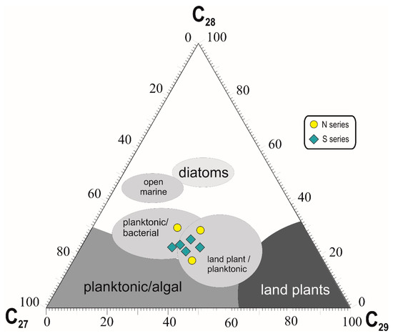 Ternary diagram of relative percentage of cholestanes (C27), ergostanes (C28) and stigmastanes (C29).