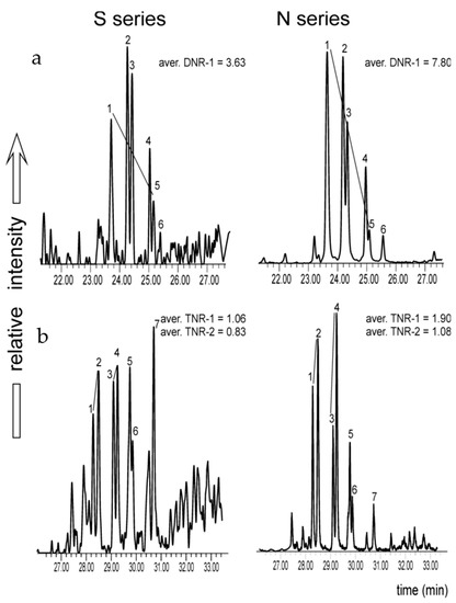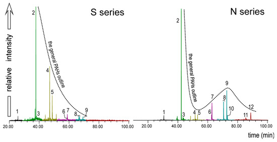 Distributions of PAHs groups with 2–3, 4–5 and 6–7 condensed rings show elevated contents of the heaviest PAHs, compared to USCB bituminous coals analyzed previously [52]. The different distribution patterns distinguishing the N and S sample sets are also seen in the distribution of PAHs (Figure 14).