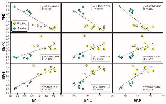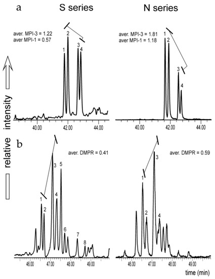 Lighter aromatic hydrocarbons include alkyl derivatives of naphthalene, biphenyl, anthracene, phenanthrene, chrysene and pyrene. To assess the thermal influence on the organic matter, the following ratios of alkyl aromatic hydrocarbons were calculated: methylnaphthalene ratio (MNR), dimethylnaphthalene ratio (DNR), trimethylnalphthalene ratios (TNR-1, TNR-2 and TNR-5), methylphenanthrene indices (MPI-1 and MPI-3), a sum of methylphenanthrenes to phenanthrene (MP/P), dimethylphenanthrene ratio (DMPR), a sum of dimethylphenanthrenes to phenanthrene (DMP/P), methylpyrene ratios (MPyR1 and MPyR2), methylfluorene index (MFI) and methylfluorene ratio (MFR) (Table 5). Based on MPI-1 values, calculated vitrinite reflectance (Rc) values were determined for comparison with measured values (Rr) [77,78,79].