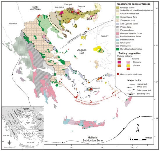 Simplified map of Greece showing the main geotectonic zones, the major tectonic structures within the Hellenides, and the distribution of the gem corundum (rubies and sapphires) in Paranesti, Gorgona, Ikaria island and Naxos island of Greece. The geotectonic zones of the Hellenic orogen are shown in the inset.