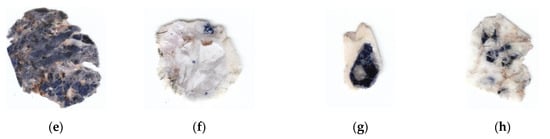 Photographs of the eight studied corundum samples from Greece. (a,b) Transparent to translucent pink sapphires hosted in amphibole schist from Paranesti in Drama (samples DR1a-a; slightly red, sized 8 cm × 7 cm × 0.6 cm and PARa-b, broken in two pieces, total size 12 cm × 10 cm × 0.5 cm); (c) transparent to translucent pink (slightly purple) sapphire hosted in marble from Gorgona in Xanthi (sample GO5a broken in two pieces) total size 10 cm × 7.5 cm × 0.6 cm; (d) transparent to translucent sapphire hosted in marble from Gorgona in Xanthi (sample GORa) sized 11 cm × 8 cm × 0.4 cm; (e) transparent to translucent light blue to blue sapphire hosted in meta-bauxite from Ikaria island (sample IK1b sample) sized 16 cm × 2.5 cm × 0.2 cm; (f–h) transparent to translucent colorless to blue sapphires hosted in plumasite from Kinidaros, Naxos island (samples NX1a-f, sized 9.5 cm × 8 cm × 0.5 cm, NX2a-g, sized 7.5 cm × 4 cm × 0.6 cm and NX4a-h, sized 10 cm × 4 cm × 0.5 cm).