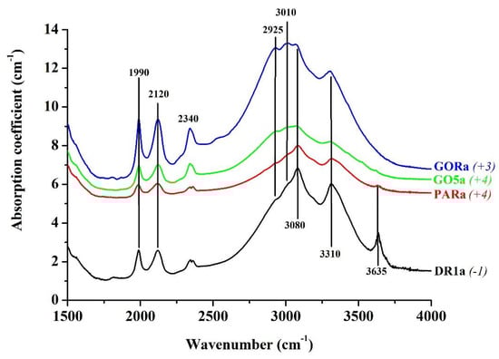 In Figure 4, the FTIR spectra of the two pink sapphires from Paranesti in Drama (DR1a and PARa) along with a pink (GO5a) and a blue (GORa) sapphire from Gorgona in Xanthi are presented. The most intense absorptions are observed above 3000 cm−1. All four spectra present similar bands with different relative intensities. For the samples from Paranesti in Drama the main apparent maxima are centered at about 3080 and 3310 cm−1. These bands are due to OH vibrations of boehmite inclusions [2]. Bands at the same position also appear in the samples from Gorgona in Xanthi. Additional bands appear at around 2925 and 3010 cm−1 in all four spectra. They are more pronounced in the samples from Gorgona at Xanthi and are related to diaspore inclusions [2,30,34]. Two bands linked to diaspore inclusions at around 1990 and 2120 cm−1 are also observed in all four samples. A weak band at around 3370 cm−1 and a second band situated around 3145 cm−1, due to OH vibrations of goethite inclusions, are also possibly present but they are hidden by the rest of the bands which are more intense bands [2]. A band at around 3635 cm−1 is clearly seen for DR1a and is less intense for the sample PARa. On the other hand, two bands with lower intensity are observed for the sample GO5a at around 3520 and 3620 cm−1. These bands are related to OH vibrations of mica and/or chlorite inclusions in the studied samples [30,35]. A band at around 2350 cm−1, which is actually a doublet, is observed for all four samples. This band could be spurious, not specimen related, associated with atmospheric CO2 and/or due to CO2 from the fluid inclusions [2,36]. The CO2 related band in the studied samples is with important intensity and with relatively large full width half maximum (FWHM; bands due to atmospheric CO2 are in general sharper with smaller FWHM compared to those due to CO2 of inclusions). Taking also into account the presence of numerous fluid inclusions in the studied samples [21], these bands are most probably attributed to vibrations related to CO2 from the fluid inclusions.
