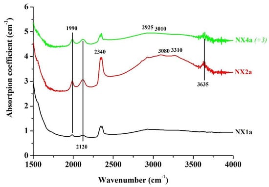 In Figure 5, the FTIR spectrum of the sapphire from Ikaria Island (IK1b) is presented. All absorption bands are similar to those observed to Figure 4, but for this sample the diaspore related bands situated at 2925 and 3010 cm−1 along with those at 1990 and 2120 cm−1, are the most intense. Bands due to CO2-rich fluid inclusions, boehmite, mica and/or chlorites are also observed. All bands for IK1b present a relatively important absorption coefficient, which indicates that the above-mentioned inclusions are possibly more pronounced in this sample. In Figure 6 the FTIR spectra of the three sapphires (from very light blue to blue color) from Naxos island are shown. These samples exhibit the same bands described above but with the lower absorption coefficient. Only the sample NX2a exhibits CO2 related bands with relatively important intensity.