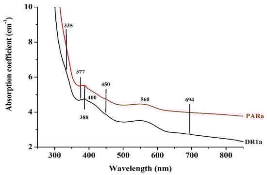 Figure 7, Figure 8, Figure 9 and Figure 10 show the UV-Vis absorption spectra from 250 to 850 nm of the studied samples. At the pink sapphires from Paranesti (PARa and DR1a, with the latter being slightly red) two large absorptions at 405 and 560 nm, as well as a weak sharp band at around 694 nm (a doublet called “R1 and R2 lines”), are observed (Figure 7). The absorptions are linked to Cr+3 which usually gives a pink to red color to sapphire [1,2,3,5,37]. Additional weak sharp bands appear at 377 and 450 nm, due to Fe+3-Fe+3 pairs and at 388 nm, due to single Fe+3 ions [1,2,3,38,39,40,41,42]. In the ultraviolet (UV) region of the electromagnetic spectrum, a cut off (absorption edge as known as total/full absorption) at around 300 nm (295 nm for DR1a and at 305 nm for PARa) along with an intense shoulder, of debatable origin, at around 335 nm are observed [2].
