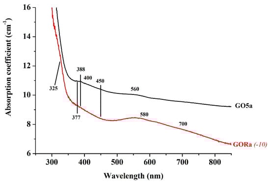 Figure 8 exhibits the absorption spectra of the light pink, slightly purple, sapphire GO5a and the blue sapphire GORa from Gorgona. Sample GO5a shows the same absorption bands in the visible range as the samples presented in Figure 7, with the chromium related bands situated at 400 and 560 nm and the iron related narrow bands situated at 377, 388 and 450 nm having lower intensity. Chromium related bands do not appear in the spectrum of the blue colored GORa sample; only the Fe+3 related bands at 377, 388 and 450 nm. Additionally, a broad absorption from 500 to 750 nm is observed with apparent maxima at around 580 nm and another at around 700 nm. These bands are responsible for the blue color and are related to intervalence charge-transfer by Fe2+-Ti+4 [2,41,42,43,44,45]. The cut off for the sample GO5a is at around 310 nm and for the sample GORa at around 295 nm. The latter is also presenting a shoulder at around 325 nm.