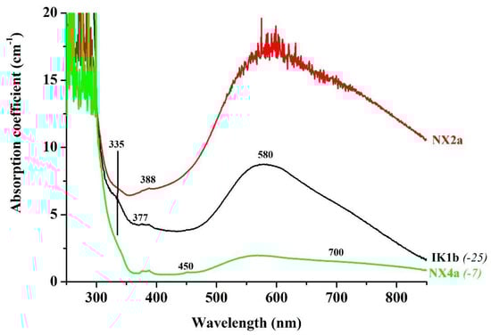 UV-Vis spectra of blue sapphires can give valuable information regarding their host geological environment [2,13,28,29,50,51]. Basalt-related sapphires are known to present a broad band at around 880 nm of higher intensity compared to those observed at around 580 nm due to Fe2+-Ti+4. The cause of the band at 880 nm is still under discussion with intervalence charge-transfer by Fe2+-Fe+3 as a possibility [52]. None of the studied sapphires present this band, excluding a possible basaltic origin. Four studied samples (GORa, IK1b, NX2a and NX4a) show a shoulder at around 335 nm (the GORa at 325 nm) of various intensities. Despite the fact that this shoulder is of debatable origin, its presence denotes the metamorphic or metasomatic origin of the samples [50,51]. All studied sapphires present a complete absorption (“cut off”) situated from 295 to 300 nm; only the light blue colored sample NX1a demonstrates a “cut off” at around 330 nm without the presence of shoulder. In earlier studies [21] it has been concluded that the Paranesti, Gorgona and central Naxos corundum deposits are classified as metamorphic and metasomatic, respectively, while those from Ikaria display atypical magmatic signature indicating a hydrothermal origin.