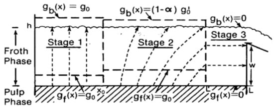 The two-stage tractable model (Figure 1) also presents a clear insight into the flow of the froth and hence has important implications for froth zone design and froth flow modifying techniques. The model posits that the froth zone can be divided into zones or stages. In each stage, a certain type of flow occurs. For instance, in stage 1, all bubbles break up upon reaching the surface of the froth and do not contribute to concentrate flow. This stage is termed a dead zone. In stage 2, only a fraction of the bubbles entering this stage break on the surface, with the balance reporting to the concentrate. In stage 3, all bubbles that enter the froth report to the concentrate. This model was further developed by [3,30,31] and its import in froth zone design and optimisation is that froth stability is critical to efficient froth removal, and particular attention must be paid to activating stage 1 and improving drainage in stage 3. Physical froth flow modification must then include reducing dead zones (stage 1) and improving drainage in stage 3 of flotation froth zone.