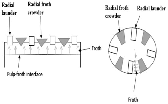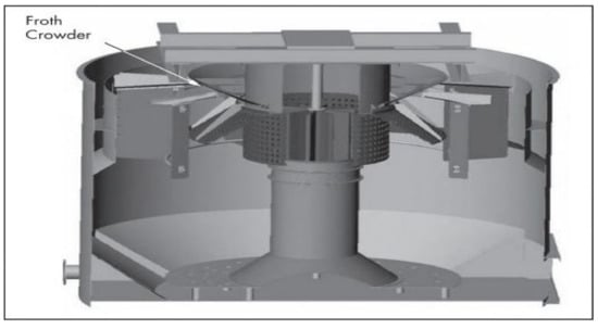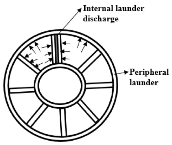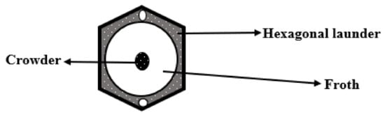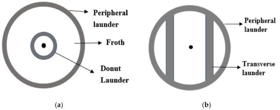 Launders were first introduced into flotation cells by Hoover [12]. Launders are physical inserts that are used to direct the froth formed in the flotation cell to a concentrate weir [13]. They exist in the form of a channel into which the froth overflows [14] and is directed to the concentrate weir. A launder can also be defined as an inclined drainage channel that removes the froth from the cell lip [63]. Therefore, launders are found internally at the top of cylindrical flotation cells (Figure 2) or outside the overflow lip. Their function is to gather and transport the froth out of the flotation cell in both cylindrical and rectangular cells. The design of launders varies with cell size, type of flotation cell, and intended duty [13,63].