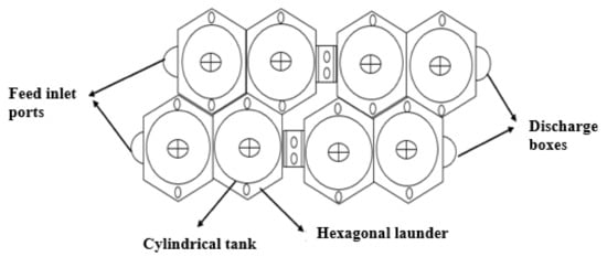With this type of launder, hexagonal-shaped overflow froth launders are mounted at the edge of the cell to optimise froth collection [72] as shown in Figure 6. Lawrence [72] patented this type of launder to collect froth in cylindrical flotation cells. Hexagonal launders allow for a unique beehive nesting arrangement of launders in rows of cells, as shown in Figure 7. This is a peripheral launder that has the advantage of optimising cell volume and delivering more LL. The hexagonal design allows for an arrangement of rows of cells in a bank in a honeycomb fashion which reduces flotation circuit footprint.