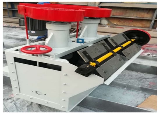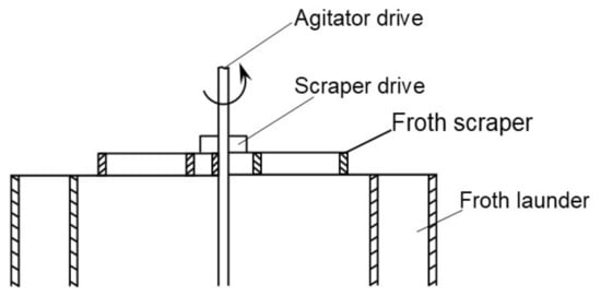 Froth paddles first emerged with a design composing of a flat-shaped plate attached to a horizontal shaft parallel to the flotation cell lip to assist with froth removal [75]. The paddle shaft is driven at reduced speeds at the edge of the cell. In circular flotation cells, a froth scraper or full surface paddle is attached to the impeller, but it rotates slowly at a continuous radial velocity [60,74]. In laboratory flotation exercises, froth scraping is done manually or by employing automatic pedals. The typical scraping rate is one scrape every 10–15 s. Increasing the scraping rate increases the mass or yield of the concentrate [76]. In industry, high concentrate mass pulls are common in coal flotation and in rougher and cleaner stages, which requires the use of mechanically driven paddles to skim the froth off periodically and to maximise the yield [24,59].