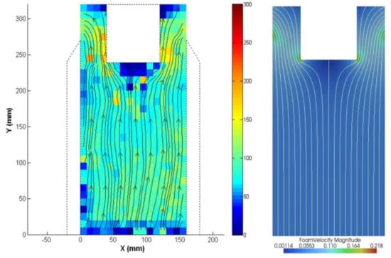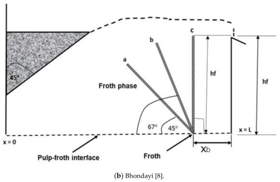 To discuss the concept of physical froth flow modification, we refer to the froth transport models that are available in the literature. These models depict how the froth is transported from the pulp–froth interface to the concentrate launder. We base our discussion on two froth models that were considered by Moys [7] as being capable of describing the flow of the froth; these are: (i) solution for the 2D stream function equation/Laplace equation; and (ii) the two-stage tractable model. Application of the 2D stream function (Equation (1)) to describe the flow of froth was found to be adequate by several researchers [8,27,28,29]. Of importance in the current work is that process parameters such as froth residence time distribution, bubble streamline profiles and bubble velocity distribution can be obtained using this model. When using this modelling method, Moys [7], and later Bhondayi [8], found that bubbles close to the concentrate weir had a very short residence time compared to bubbles that enter the froth close to the back of the flotation cell. This has two implications that are detrimental to flotation performance, viz., short froth residence time compromises concentrate grade, while a longer residence time reduces recovery. These findings are critical when designing froth zones and froth removal methods or when modifying the flow of the froth.