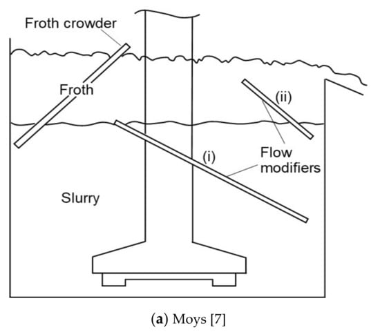 The extent of the froth phase sub-processes is dependent on two crucial froth properties: viz. froth stability and froth mobility. While it is known that froth stability depends on gas dispersion conditions, chemical conditions, and particle properties, it is also known that properties such as froth mobility can be increased by manipulating the froth zone (the compartment of the flotation cell that contains the froth). For instance, Cole et al. [6] reported that decreasing the cross-sectional area at the top of the froth increases froth mobility. Moys [7] and Bhondayi [8] found that manipulation of the froth zone can also be used to modify froth residence time distribution, i.e., froth mobility. Consequently, through practice and iterative research, several techniques to modify froth mobility and improve froth performance have been developed. These include froth launders [9,10,11,12,13,14,15,16]; froth crowders [14,17,18,19,20,21,22]; froth baffles [7,8,23]; and froth scrapers/froth paddles [24,25]. The major functions of these techniques are to modify and optimise the flow of the froth, reduce dead zones, and improve froth flow and removal dynamics [2,18,26].