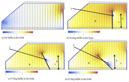 Some of the challenges associated with froth mobility in large flotation cells are generally dealt with by inserting an external implement [14], which is referred to here as a froth flow modifier. These inserts can modulate froth residence time; therefore, the presence of a froth flow modifier plays a significant role in altering froth mobility. For instance, Bhondayi et al. [52] found that the presence of a baffle drastically changes the streamlines followed by the bubbles as they rise from the pulp–froth interface to the surface of the froth. The results of their simulations (using the 2D stream function equation) also point to changes in the distribution of froth residence time [52]. Cole [17] also found that froth crowders improve froth mobility by reducing the cross-sectional area available for the froth. Cutting et al. [24] found that paddles assist in froth removal dynamics and therefore change froth mobility.