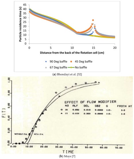 Table 1 shows the general values for a whole bank of mechanical flotation cells in metal sulfide operations with a feed of P80 > 80 microns, as suggested by [19,56,57,58]. Non-sulfide minerals such as iron and coal have a much higher FCR rate, as observed by [19]. Thus, in addition to influencing the froth phase sub-processes, physical froth flow modifiers can also be used to alter FCR and LL in a flotation cell.