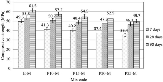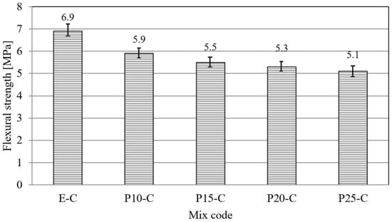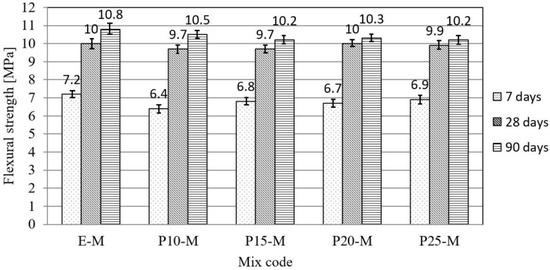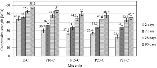 The flexural strength test was performed at the ages of samples for 28 days (Figure 5). It can be noticed that the flexural strength decreased with the increase in the replacement of cement, and that was compared to the reference concrete in the range from 14 to 26%. Compressive strength was the most significant characteristic of concrete, and it was determined at test specimen ages of 2, 7, 28, and 90 days (Figure 6). Firstly, it was observed that with the increase in cement replacement by waste material, the strengths of concrete specimens decreased at all ages of concrete. In the first 7 days, the highest increase in compressive strength was recorded with the reference mortar, while with increasing age the compressive strength of concrete prepared with waste material approached the reference concrete due to the delayed pozzolanic reaction [23]. The decrease in compressive strength at 90 days was 7.2–21.7% with a percentage replacement of cement of 10–25%. The possible reason for the reduction of the final strength of concrete with the waste material is the lower density of concrete in comparison with the reference concrete due to the higher entrained air content and the lower amount of aggregate.
