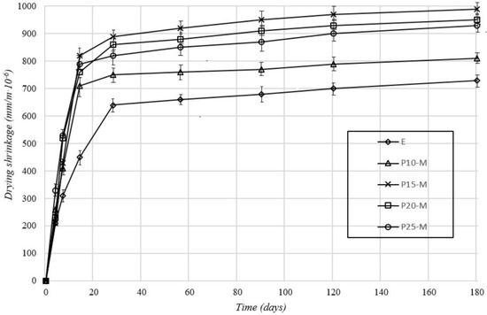 Based on the shrinkage measurements results due to the drying of cement mortars, (Figure 3), it can be observed that mortar mixtures with the addition of waste material had higher shrinkage values than the reference mortar, wherein the shrinkage was greater at a later curing stage. The reason for the increased shrinkage is the pozzolanic reaction of slag and silica fumes. Similar trends were observed by researchers for an examination of the influence of glass powder on the properties of cement mortar [19]. It should be mentioned that the highest shrinkage was recorded in the mortar mixture with 15% of cement replacement. This was likely because the porosities of the mortar mixtures, P20-M and P25-M, were higher than the porosity for P15-M, which means that these mixtures had a lower volume of the cement paste shrinking during hardening.