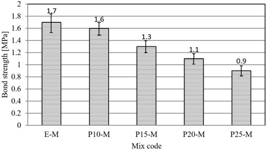 The replacement of cement with waste material had the effect of reducing the adhesion of the mortar to the concrete substrate. With an increase in the percentage of cement replacement, the adhesive strength decreased, with a decrease of 6–47% (Figure 4). The possible reason for the reduction of adhesion in mortars with a higher content of waste material is the lower quantity of free water necessary for the hydration of cement materials in the hardening period.