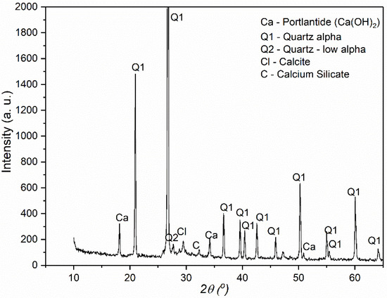 The results of the XRD analysis show that the following crystal phases are present in the investigated sample: quartz as the most abundant, then portlandite and calcite, while calcium silicate-oxide is less present.
