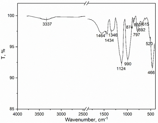 The infrared spectrum of the hardened mortar is given at Figure 8. In the spectrum of the hardened mortar, spectral bands at 3337, 1464, 1434, 1124, 990, 874, 850, 692, 615, 520, and 466 cm−1 are visible. The spectral band at 3337 cm−1 may be assigned to the H–H stretching vibrations due to the presence of the physical-bounded and surface-adsorbed water [27]. The bands at 1464 and 1346 cm−1 are characteristic of and confirmed the presence of Ca(OH)2 [28]. The bands of 1434, 874, and 692 cm−1 are attributed to in- and out-plane bending and asymmetrical stretching vibrations of the O–C–O, respectively, which occur due to the presence of the CaCO3 [29]. The bands at 1100, 797, and 615 cm−1 indicate the presence of the SiO2 and are characteristic of asymmetrical and symmetrical stretching modes (1100, 797 cm−1) and bending mode (615 cm−1) as weak bands [30]. The spectral band at 466 cm-1 originates from Fe-O vibrations due to presence of iron oxide (Table 1) [31,32].