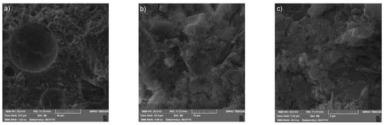 Flexural strength was determined in accordance with standards EN 196-1, EN 1015-11 and was tested on the prisms with dimensions 40 mm × 40 mm × 160 mm. The tests were conducted on the hydraulic press UTCM-6710 (Utest, Ankara, Turkey) with a measuring range of 0–10 kN of the flexural force and accuracy class 0.5%. Compressive strength was determined according to standards EN 196-1 and EN 1015-11 and was tested on the halves of the prisms obtained after testing flexural strength. The test was conducted on the hydraulic press UTEST UTCM-6710 with a measuring range of 0 to 250 kN of the compressive force and accuracy class 0.5%. Water absorption (determination of water absorption at atmospheric pressure) was determined according to EN 13755 and was conducted on the prisms with dimensions 40 mm × 40 mm × 160 mm. Prisms were firstly dried at the temperature of 70 ± 5 °C to the constant mass, and then were saturated in water. The percentage difference of masses of a saturated and a dry sample, and the mass of the dry sample represents the water absorption at atmospheric pressure.