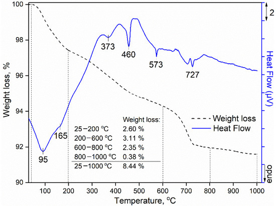 From the results presented in Figure 10, it may be concluded that thermal analysis confirms the results of XRD and FTIR analysis and peaks characteristic of the phases present to the greatest extent are visible. As it may be seen from Figure 10, on the DTA curve of the investigated sample in the first temperature interval (25–200 °C), two endothermic peaks are visible, at 95 and 165 °C, of which the first one is associated with endothermic reactions such as the dehydration and removal of physically adsorbed water, while the second one originates from the dehydration and decomposition of the hydrates of the silicate-oxides, as well as calcium silicate-oxides [34]. This process has been followed with a weight loss of around 2.60% on the TGA curve. In the second temperature interval (200–600 °C) endothermic peaks are observed at 373, 460, and 573 °C. The peaks at 373 °C and 460 °C originate due to the decomposition of the calcium-hydroxide [34], while the existence of the endothermic peak at 573 °C confirms the presence of quartz (river sand) and or silicate fume (SiO2) [35]. In this temperature interval (200–600 °C) determined mass loss by TG analysis was 3.11%. Weight loss in the third temperature interval (600–800 °C) of 2.35% and the endothermic peak at 727 °C, is caused by the decomposition of the carbonates, which is additional confirmation of the presence of the calcite (CaCO3) in the designed mortar [36].