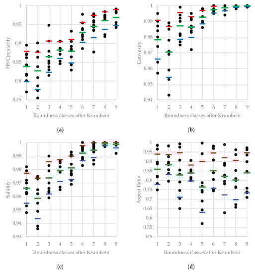Values of patterns of grain roundness classes by Krumbein []: (a) HS Circularity; (b) Convexity; (c) Solidity; (d) Aspect Ratio. Red marker: AVG + SD, blue marker: AVG − SD, green marker: AVG.