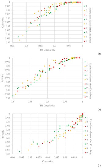 Diagrams of dependence of statistical parameters: (a) HS Circularity vs. Convexity; (b) HS Circularity vs. Solidity; (c) Convexity vs. Solidity, 1–9 Krumbein classes.