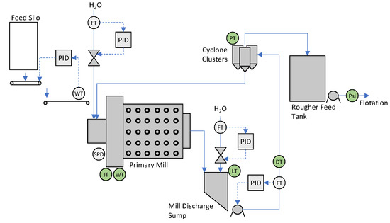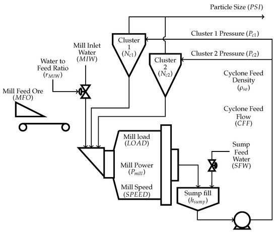 Figure 2 shows the manipulated variables (MVs) and controlled variables (CVs) as listed in Table 1. The primary milling circuit comprises of a 26 radius × 28 length ball mill with a wrap-around ABB motor and a variable speed drive (VSD). represents the power consumed by the mill, the variable rotational rate of the mill, and the total mill load as measured by load cells. As shown in Figure 3, fresh feed into the mill () is controlled by a proportional, integral, derivative (PID) controller that cascades to a VSD feeder under the silo. Water into the mill () is controlled as a ratio to the fresh feed (), cascading from a ratio controller to an inlet water PID controller. Both feed and water ratio set points are supplied by either the operator, from the Supervisory Control and Data Acquisition (SCADA) system, or the advanced process control (APC) system. The mill discharges through a partial overflow mechanism into the discharge sump. Two cyclone packs with 10 cyclones each in a duty/standby operating philosophy close the circuit loop. The coarse underflow is recycled back to the mill with the finer overflow reporting to the rougher feed surge tank and onto primary flotation. The APC also controls the discharge sump level (), discharge density (), and cyclone cluster pressure ( and ) by manipulating the discharge sump dilution water flow rate (), cyclone slurry flow rate (), and the number of open cyclones ( and ) in a cluster. The final product particle size passing 75 m () at the cyclone overflow is measured by a BlueCube analyzer. The advanced control strategy includes a layered approach consisting of PID, fuzzy logic-based and model predictive control, as described by Steyn et al. [14].
