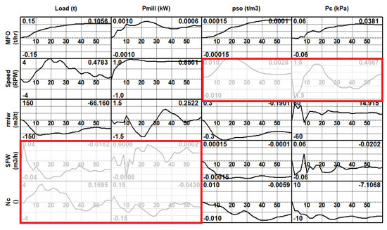 A further point to note is that not all models calculated are implemented in the seed models used to bootstrap an automated stepping campaign. The reason for this is that if the models are not well known, then weak directions need to be avoided. The models that would be deleted are shown with red boxes around them in Figure 8. The load and power to sump feed water and number of cyclones to inlet water ratio models would be removed on physical grounds. The discharge density and cyclone pressure to speed model would be removed on the basis of small scaled gains. The resulting matrix would be robust enough for seed model purposes.