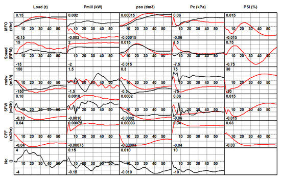 The planned step data is particularly suitable for identifying linear dynamic models, as the inputs tend to be uncorrelated. The CVA method was used to generate a matrix of SS models for the system. The results are shown in Figure 10, where they are overlaid with the models calculated from the planned steps. Note that no steps were made on the number of cyclones in operation, so this variable is excluded from the models. It would be usual to delete some of these curves based on either physical intuition or small gains. This has not been done here to retain all the curves for comparison with those calculated from the DQA-determined data.