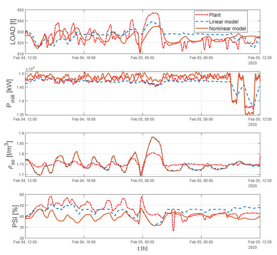 The goodness-of-fit statistics for the two models are given in Table 4. All the models have small mean squared errors (MSEs). The correlation coefficient for the power () and discharge density () are very good, but poorer for the load () and, in particular, the grind (). The nonlinear model gives a superior prediction of the discharge density and load. Further investigation would be needed to determine why the grind predictions are poor, as this could be due to either an unmodelled effect or a fault in the instrument.