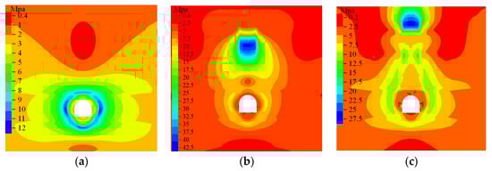 (2) The upper boundary of this model was a free boundary, and a vertical uniformly distributed load was applied to simulate the self-weight load of overlying strata. Given the influence of self-weight of this model, the self-weight load of overlying strata applied was 22.5 MPa.