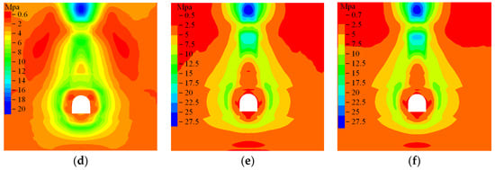 Evolution Nephogram of Maximum Principal Deviatoric Stress in Surrounding Rock of Roadway under Dynamic Load Disturbance. (a) before dynamic load disturbance; (b) dynamic load disturbance of 0.01 s; (c) dynamic load disturbance of 0.03 s; (d) dynamic load disturbance of 0.05 s; (e) dynamic load disturbance of 0.07 s; (f) dynamic load disturbance of 0.09 s.