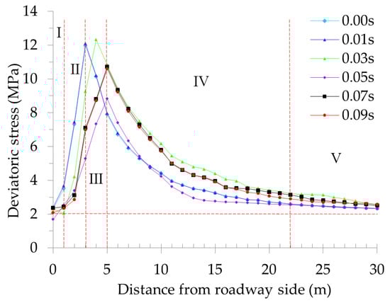 As shown in Figure 4, an annular stress zone (Figure 3a) was formed at 3 m of the roadway perimeter after the excavation unloading. When the dynamic load disturbance was generated at the roof, a core stress zone was formed in the center of earthquake focus, where the maximum value deviatoric stress reached as high as 40 MPa. When the dynamic load acted for 0.01 s (Figure 3b), the dynamic load stress wave started propagating downward. However, the deviatoric stress value at two walls of the roadway was not obviously changed and mostly overlapped with the evolution curves of deviatoric stress in the surrounding rock of the roadway before the dynamic load disturbance. This condition indicated that the dynamic stress wave did not propagate to the roadway. The surrounding rock in zone I was close to the free space of the roadway, and the deviatoric stress aggravated the failure degree of the surrounding rock. The deviatoric stress first declined with the curve shifting down. At 0.03 s of dynamic load action (Figure 3c), the deviatoric stress at two walls of the roadway was transferred from shallow surrounding rock to the deep part, and the peak point shifted backward. The deviatoric stress reached as high as 12.5 MPa under the dual influences of roadway excavation and dynamic load stress wave. The cracks in the surrounding rock of zones II and III were incompletely developed with a great attenuation coefficient, which militated against the stress transmission, and the deviatoric stress acted on the surrounding rock, leading to its yield failure. Subsequently, the deviatoric stress presented a declining trend, and the decrease amplitude was larger than that in zone I. At 0.05 s (Figure 3d), the dynamic load stress wave acted on the surrounding rock in the whole roadway and formed a stress ring in which the deviatoric stress progressively increased from the inside to the outside. As shown in Figure 4, the deviatoric stress inside the surrounding rock beyond 30 m away from the roadway wall was gradually stabilized and approached a deviatoric stress value (2 MPa) before the dynamic load. From the macroscopic angle, the deviatoric stress in the surrounding rock of the roadway was redistributed within the 30 m range of two walls after the dynamic load disturbance was generated. However, the deviatoric stress sharply increased, reached its peak point, and then suddenly dropped within the 5 m range of the roadway wall. The surrounding rock in the roadway was extremely susceptible to instability failure due to the dynamic and static load superposition at the border between zones III and IV. Subsequently, the stress state of primary rock was approximated increasingly, followed by a relatively stable phase.