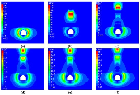 Evolution Nephogram of the Distortion Energy of Surrounding Rock under Dynamic Load Disturbance. (a) before dynamic load disturbance; (b) dynamic load disturbance of 0.01 s; (c) dynamic load disturbance of 0.03 s; (d) dynamic load disturbance of 0.05 s; (e) dynamic load disturbance of 0.07 s; (f) dynamic load disturbance of 0.09 s.