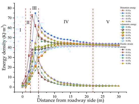 Dynamic Evolution Curves of the Energy Density of Surrounding Rock under Dynamic Load Disturbance. (I—broken zone; II—original plastic zone; III—newly added plastic zone; IV—elastic zone; V—stress zone of primary rock).