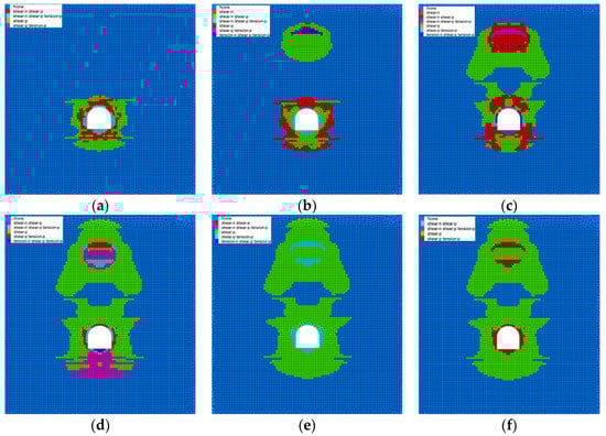 Evolution Nephogram of Plastic Zone under Dynamic Load Disturbance. (a) before dynamic load disturbance; (b) dynamic load disturbance of 0.01 s; (c) dynamic load disturbance of 0.03 s; (d) dynamic load disturbance of 0.05 s; (e) dynamic load disturbance of 0.07 s; (f) dynamic load disturbance of 0.09 s.
