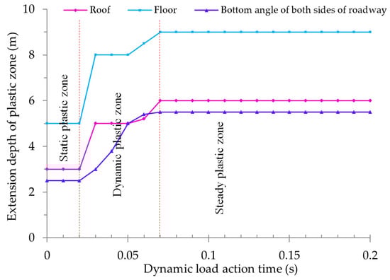 The evolution nephogram of the plastic zone in surrounding rock with the dynamic load disturbance is shown in Figure 7. The variation tendency chart of the expansion depth of the plastic zone in the action of dynamic load disturbance is displayed in Figure 8.