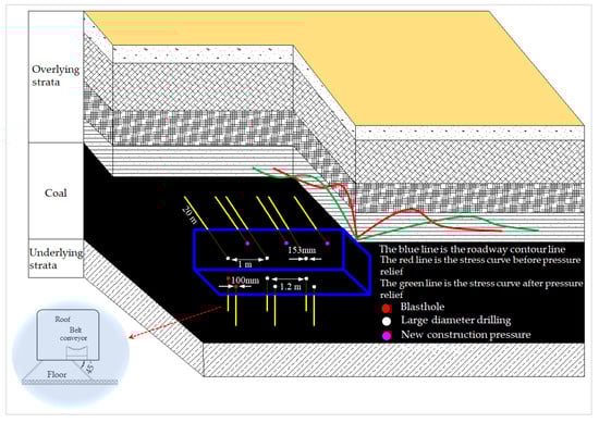 Major-diameter (153 mm) holes were drilled at the two walls of the roadway at the coal seam in No.1 mining area for the pressure relief of the coal mass at the walls. Their angle was perpendicular to the coal wall, and they were 1.2–1.6 m away from the floor. The length was 20 m, and the spacing was 1.0 m. Three drill holes were arranged at one row, and the hole sealing length was greater than 2 m. Major-diameter holes were drilled once again in the zone with rock burst risk for pressure relief, and the holes presented a three-petal-like arrangement with the original major-diameter drill holes. The depressurization holes were staggered with blast holes at the floor of the main roadway at the coal seam in No.1 mining area. One blast hole was first constructed, followed by two major-diameter drill holes. The subsequent construction was implemented similarly. The hole spacing was 1.2 m, and the diameter of the depressurization hole was 153 mm, and that of the blast hole was 100 mm. The dip angle of the drill hole was −45°, and the hole depth was ensured until the rock was naked by penetrating the coal seam at the floor. Two-row drill holes were totally constructed on the floor. The layout plan of major-diameter depressurization holes and blast holes in the main roadway is shown in Figure 9.