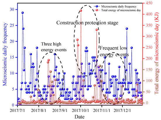 The microseismic activity can reflect the rupture status of coal and rock mass. Thus, the preventive and controlling effect on the rock burst of the working face can be largely determined on the basis of the time-dependent changes in large-energy microseismic events, where its significant reduction marks the decreasing quantity of dangerous mine earthquakes [42]. The main roadway in No.1 mining area was selected as the statistical zone. This roadway was protected in the construction during October 2017, and the data in August and September 2017 were chosen and compared with those in November and December 2017 to avoid the influence of construction on the statistical results. In August 2017, 173 effective mine earthquakes were monitored in the main roadway zone of No.1 mining area, where the maximum energy was 1.93 × 105 J, and 137 effective mine earthquakes were monitored in September, where the maximum energy was 2.85 × 105 J. In November 2017, 199 effective mine earthquakes were monitored, where the maximum energy was 9.81 × 104 J, and 266 effective mine earthquakes were monitored in December, with the maximum energy of 7.49 × 104 J.