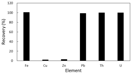 The most abundant elements after digestion in sulfides were Fe, Cu, Zn and Pb, which account for up to 95% of the total. Therefore, the elution efficiencies of Fe, Cu, Zn and Pb were mainly to be considered during leaching. Usually, Fe(OH)3 precipitation was used to adsorb most of the U and Th from carbonates or sulfides for removing most of the Ca, Mg and other major elements [1,6]. We compared the element-selective adsorption efficiencies of six elements (Fe, Cu, Zn, Pb, Th and U) during Fe(OH)3 precipitation to the standard solution SS-1. It showed that the precipitation operation could not efficiently remove Cu and Zn. The recovery rates of Pb, Th and U were similar to those of Fe (Figure 1) and incomplete Fe precipitation could lead to low U and Th recoveries. Thus, Fe(OH)3 precipitation should be considered abandoned for Quaternary hydrothermal sulfides.